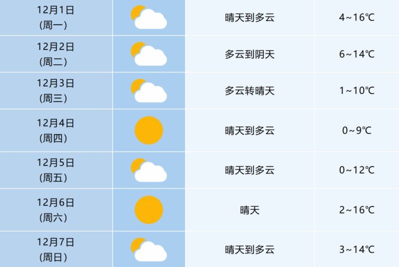 降水:未来一周全省以多云到晴天为主,12月1-2日江淮之间西部和江南部分地区有小雨天气。
