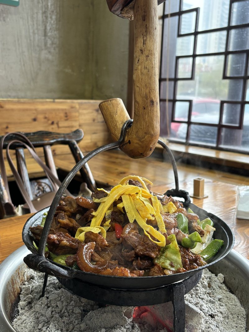 金寨吊锅,更是金寨土锅文化中的一绝。它已有1000多年历史,是家人或来客围坐火塘四周,烤火、吃菜、叙话、喝酒的特色传统。吊锅是一定要用炭加热的。一口大锅悬在正中间,里面各种肉类应有尽有,食客们惊叹“一锅纳百味”,而味道多而不乱。大口吃肉、大碗喝酒,山区人的幸福就是如此简单而纯粹。