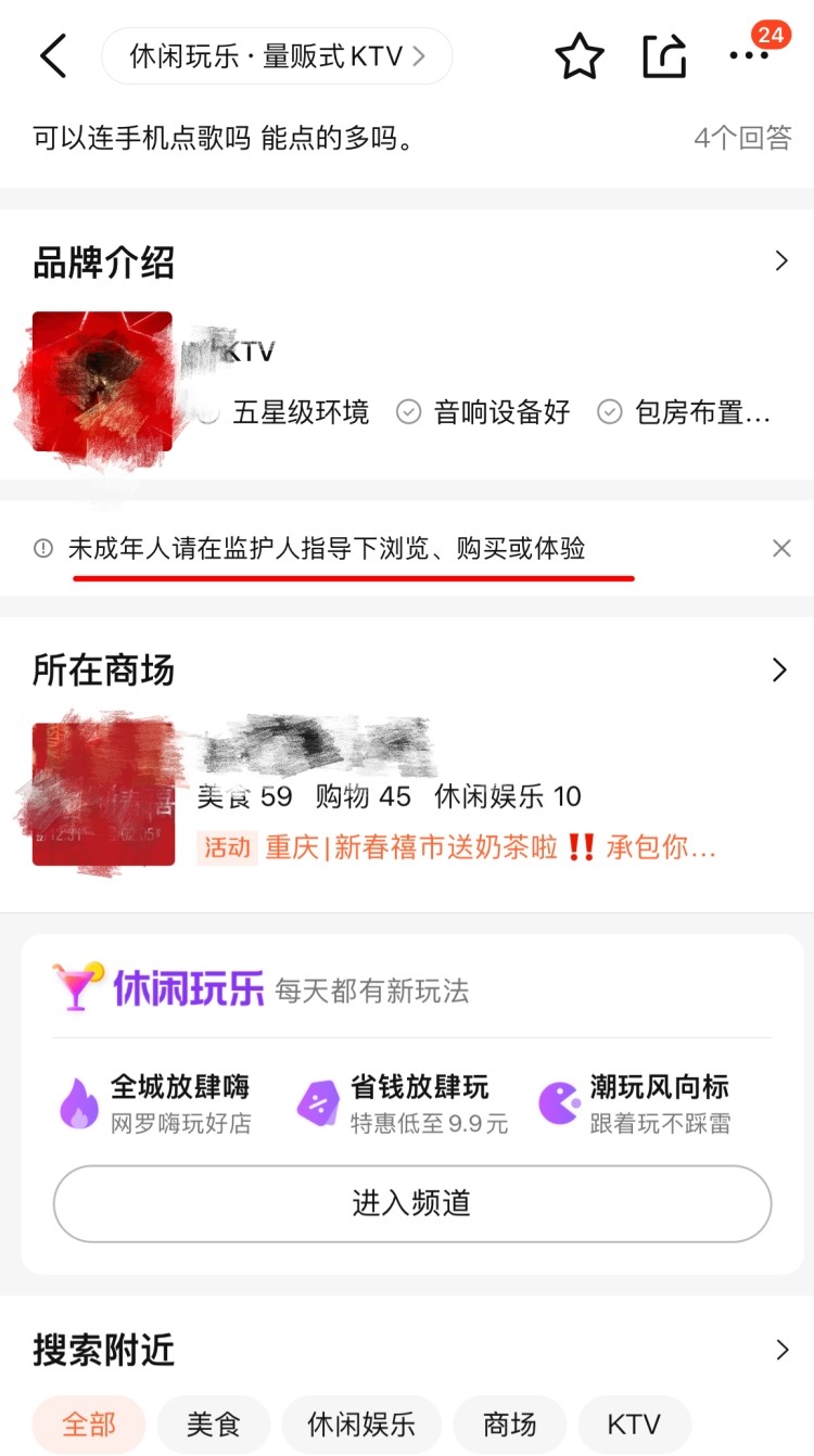 在某团购平台上,上游新闻记者在浏览KTV商家页面中发现,商家店铺首页、预定页面中都没提及未成年禁止入内,平台只提到“未成年人请在监护人指导下浏览、购买或体验”。随后,上游新闻记者通过平台上的联系电话,询问部分KTV商家“一家人想来唱歌,能不能带小孩”,对方均表示,可以带小孩但是家长必须同时在场。
