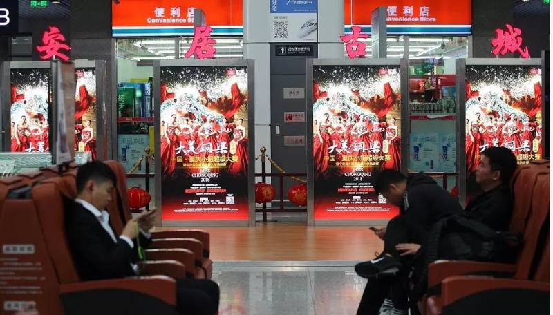 ▲作为全国铁路枢纽之一的重庆北站,日均旅客吞吐量10万人次,其优质户外大牌同样被重姐超级大赛品牌推广海报霸屏,铜梁龙和重姐碰撞出的火花,给旅客眼前一亮的视觉冲击!