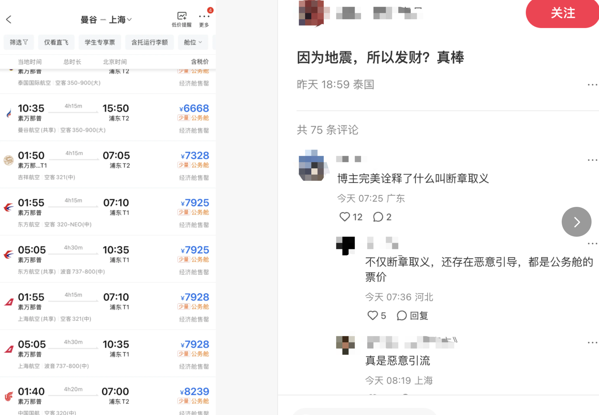 3月28日,有网友在社交媒体发布曼谷飞上海机票价格截图并配文称:“因为地震,所以发财?”疑暗示机票价格上涨,该帖迅速引起大量转发与讨论。有网友表示不满,质疑航空公司“坐地起价”,也有网友驳斥发帖博主称:“断章取义,这是公务舱票价。”