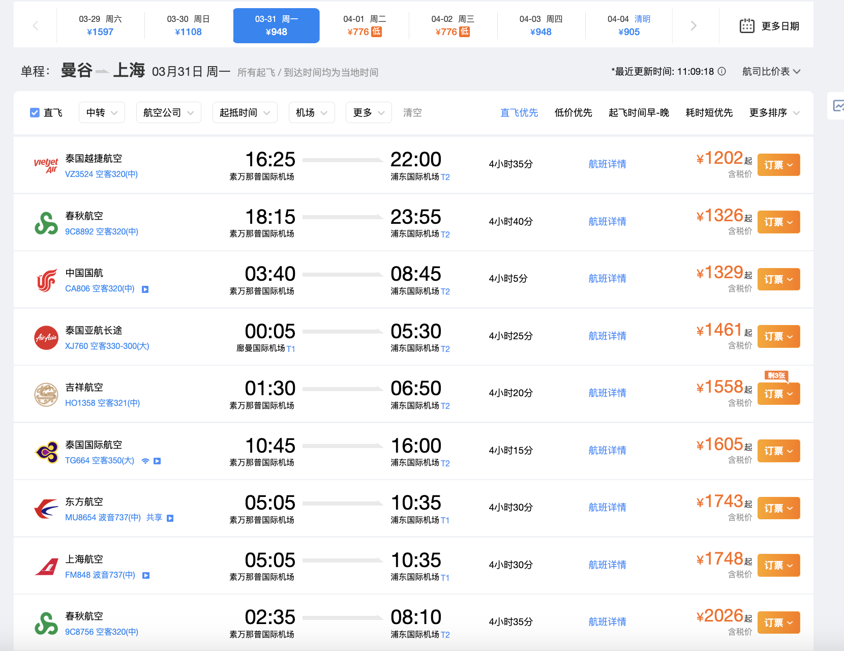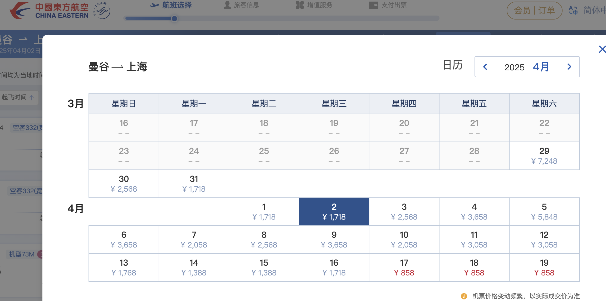 东航官网显示,近期曼谷飞上海航班经济舱票价未现异常波动。官网截图