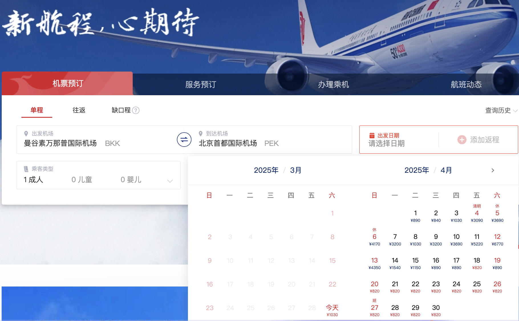 国航官网显示,近期曼谷飞北京航班经济舱票价未现异常波动。官网截图