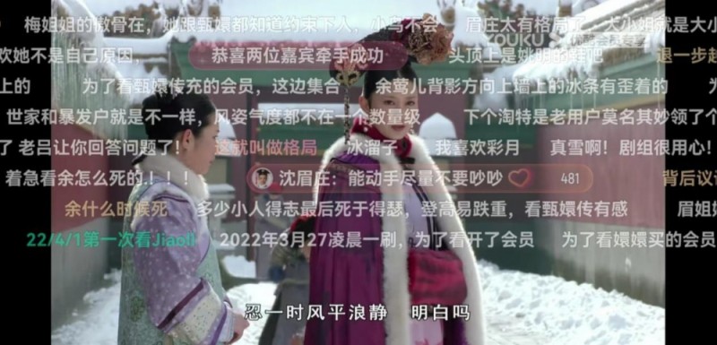 “2022年4月1日,第一次看”,“2022年3月27日凌晨,为了看《甄嬛传》我开了会员”,“2022年4月14日,不知道第几遍了”……如今,《甄嬛传》的视频画面上,依然不断有很多新弹幕加入其中。