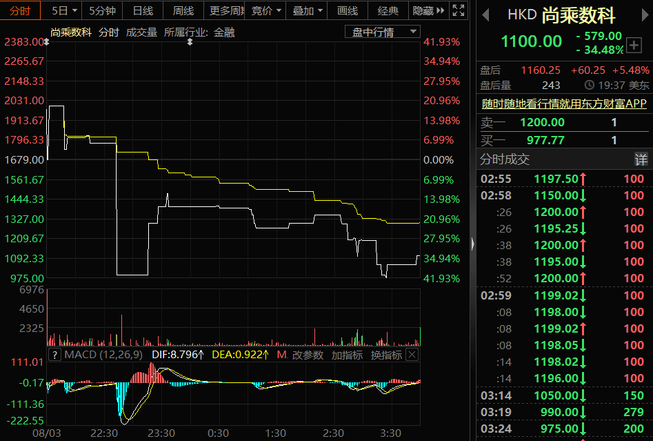 北京时间8月4日消息,隔夜,美股三大指数集体收高,不过,此前上市17天暴涨215倍的尚乘数科,终于按下了暴涨的暂停键。盘中,尚乘数科一度继续大涨,涨幅超20%,不过,随后盘中闪崩下挫,最高跌幅41%,触发熔断,截至收盘,尚乘数科跌34.48%,报1100.00美元。尚乘数科的市值为2035.5亿美元,已低于阿里巴巴(2534.80亿美元)。