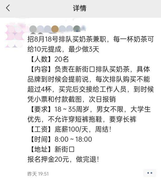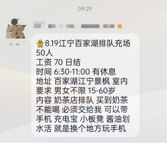 据新浪科技报道,记者在一个南京招聘QQ群中,看到了一则8月19日奶茶店排队充场的兼职信息。工资70元,日结,地址在百家湖江宁景枫,主要内容为奶茶店排队,并要求“买到奶茶不能喝,必须交给我,可以带手机、充电宝、小板凳。酱油划水活,就是换个地方玩手机。”