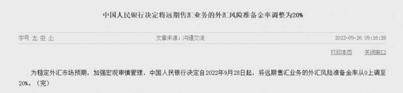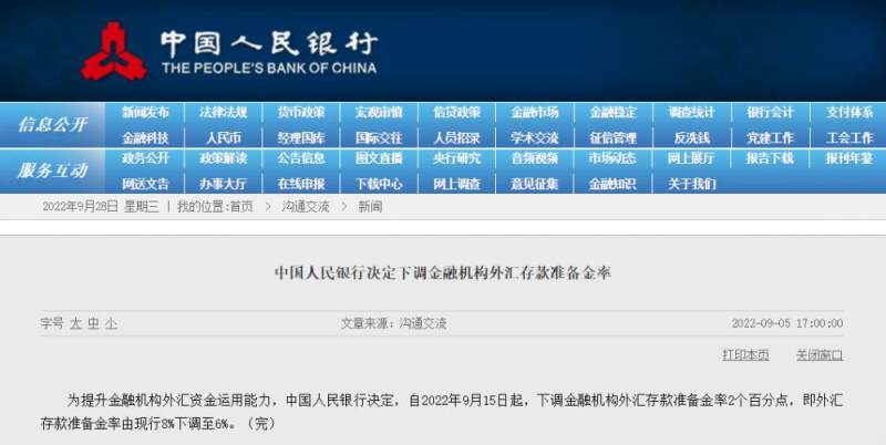 在人民币汇率持续走低的背景下,央行本月已两次出手稳定汇率。9月5日,央行宣布自2022年9月15日起,下调金融机构外汇存款准备金率2个百分点,即外汇存款准备金率由8%下调至6%。随后,9月26日,央行宣布,决定自2022年9月28日起,将远期售汇业务的外汇风险准备金率从0上调至20%。