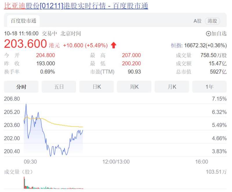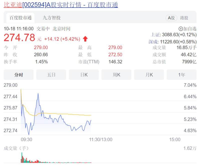 截至18日上午发稿,比亚迪A股涨5.42%,报274.78元/股;港股涨5.49%,报203.6港元/股。