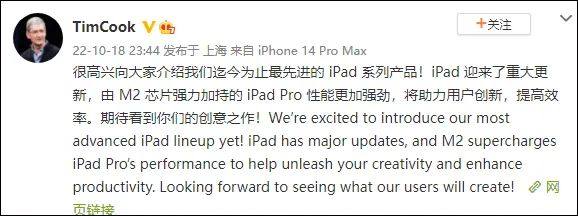 晚上11点44分,库克更新了微博,介绍iPad新品。