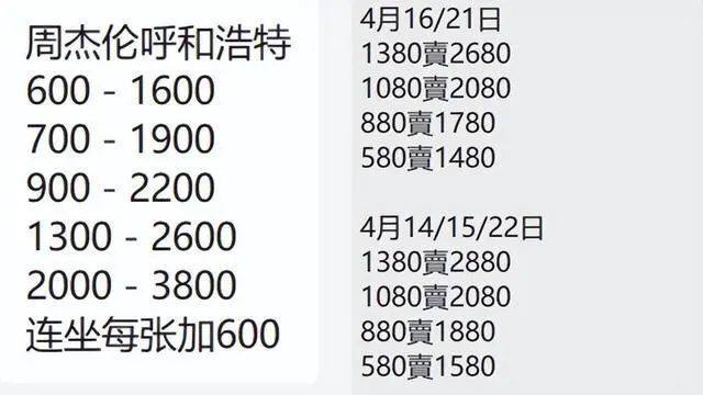 据北京商报,某黄牛向记者介绍,目前周杰伦太原站、海口站演唱会看台区900元票售价2380元,内场区2000元票售价3900元,想要连座需要每张加价600元,还宣称会有“内部”人员带队优先入场围观彩排。而五月天演唱会可支持不加价选连座,1380元价位票黄牛售价2880元,580元看台区票售价涨2.7倍至1580元。
