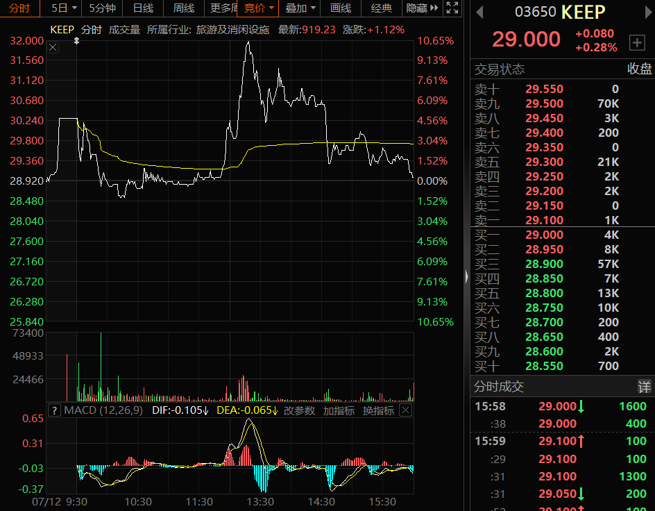 今日开盘后,Keep高开4.77%,报30.3港元,市值达159亿港元。截至收盘,Keep涨幅缩窄至0.28%,报29港元/股,市值为152.4亿港元。