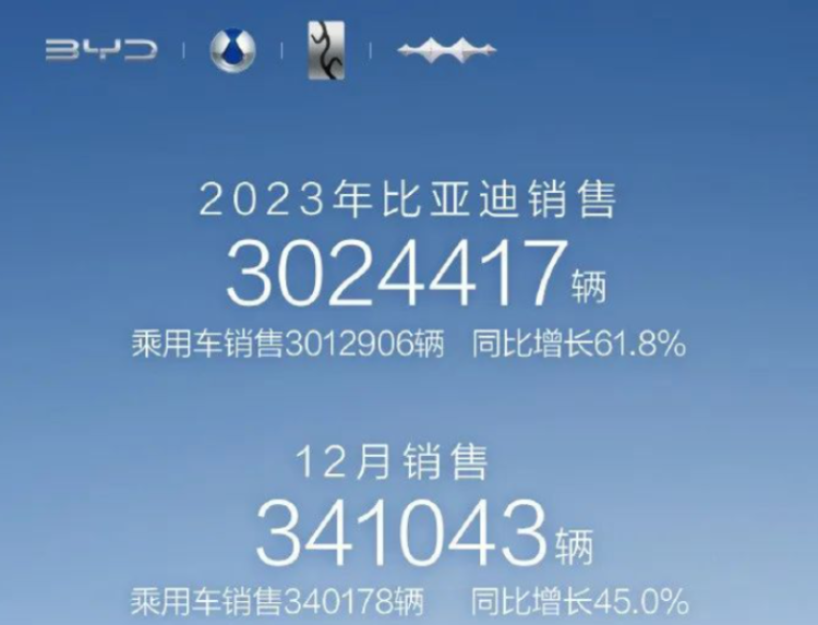 2024年1月1日晚间,比亚迪披露产销快报显示,公司2023年12月新能源汽车销量34.1万辆,包含海外销售新能源乘用车36095辆。