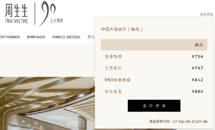 17日,周生生官网显示,足金饰品类报价达到754元/克;周大福官网17日显示,足金饰品类报价753元/克,比前一日上涨18元/克;另据菜百首饰官方旗舰店客服,17日,足金999饰品价格为756元/克。
