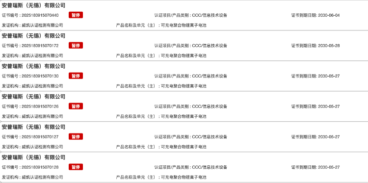 与此同时,电池供应商安普瑞斯的多个电池及电芯产品3C认证证书亦处于“暂停”状态,该公司为多家充电宝品牌提供电芯。社交平台上的多条充电宝拆解视频,不少电芯也为安普瑞斯品牌。