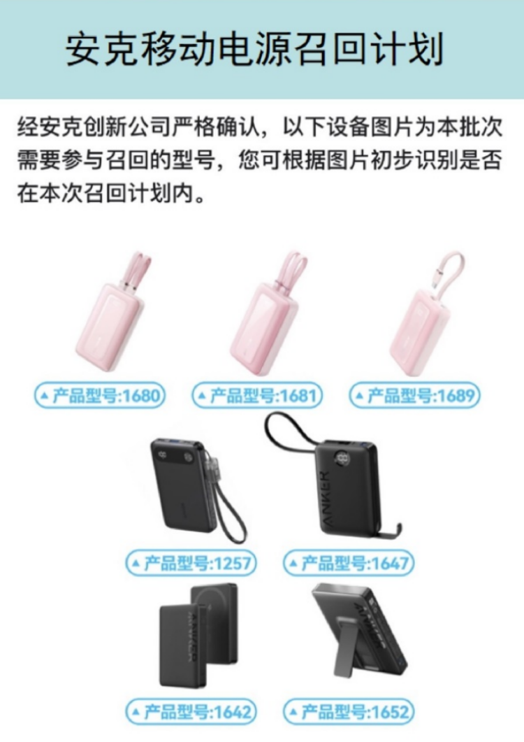 6月20日,充电宝厂家安克创新也发布公告,召回型号为A1642、A1647、A1652、A1680、A1681、A1689、A1257的部分批次产品,共计712964件,原因同样是上游电芯来料品质问题,部分批次电芯存在未经批准的原材料变更,可能引发过热甚至燃烧隐患。