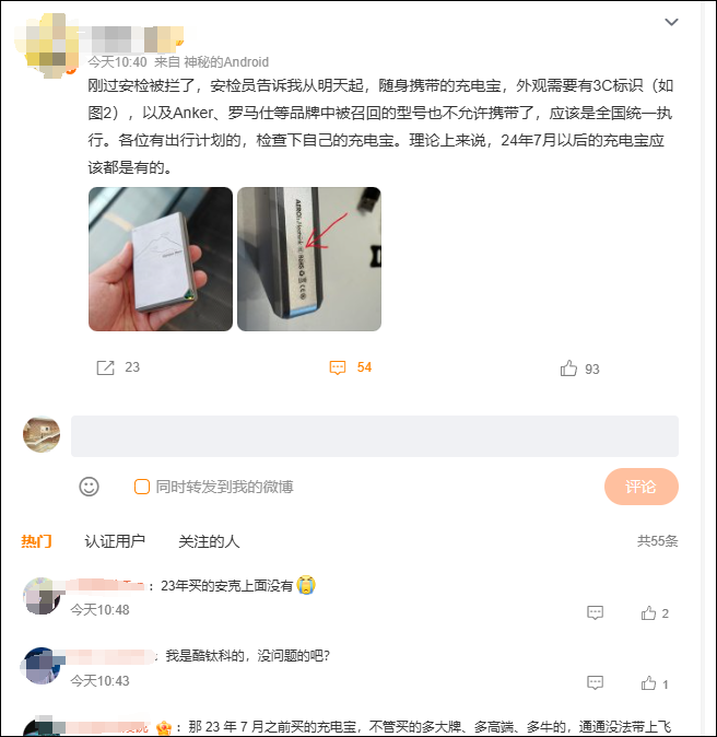 有网友发帖称自己的充电宝已经被查。