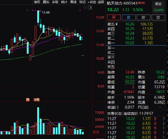 8月15日早盘,航天动力股价直接一字跌停,报10.22元,封单超1.3亿股。