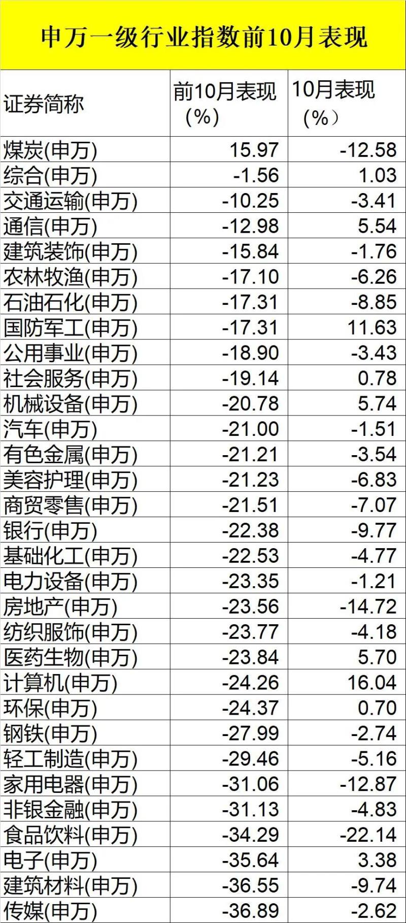 从前10月各行业的表现来看,申万一级行业中煤炭行业一枝独秀,表现较好,年内涨幅超15%,其他所有行业都出现不同程度下跌,其中传媒、建筑材料、电子、食品饮料、非银金融、家用电器等跌幅超过30%。