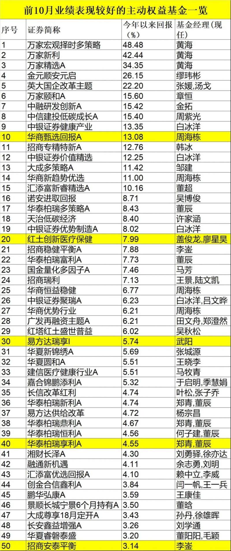 今年以来,万家基金经理黄海所管理的基金一直是年内涨幅“冠亚季军”的包揽者,前十月也不例外。截至10月31日,今年以来表现最好的主动权益基金仍为黄海管理的万家宏观择时多策略,收益率达48.48%。同为黄海管理的万家新利、万家精选A前10月收益率分别为42.44%、34.35%。