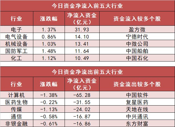申万一级行业中,9个行业实现资金净流入,其中电子行业净流入31.93亿元居首。