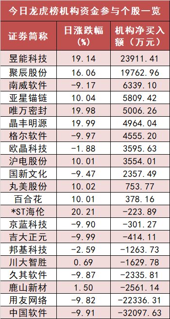 盘后龙虎榜数据显示,机构现身21股,其中昱能科技等12股呈现机构资金净买入,中国软件等9股呈现机构资金净卖出。