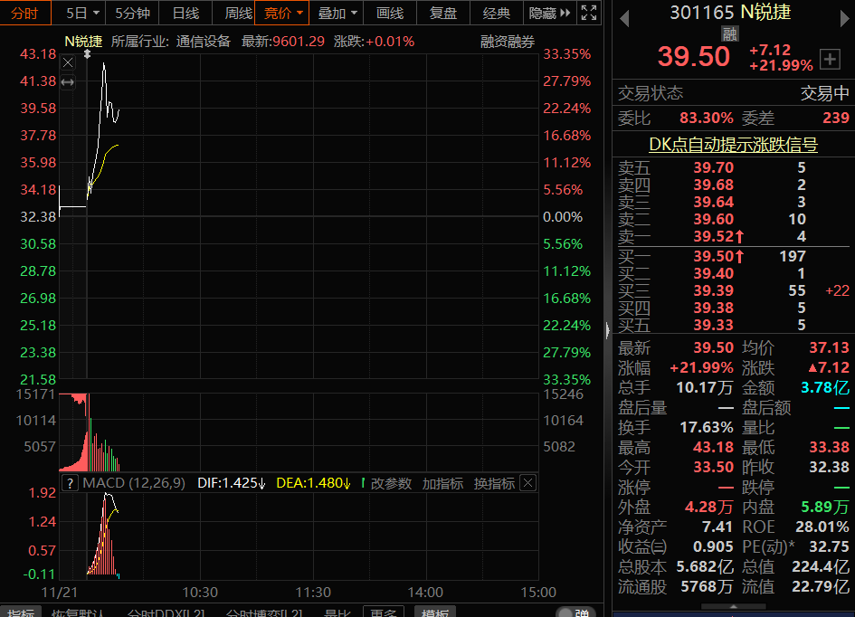 中签股民又“吃肉”了。11月21日,锐捷网络登陆创业板,开盘之时涨幅并不大,不过,开盘后,锐捷网络迅速拉升。截至记者发稿时,锐捷网络涨19.77%,报38.85元,盘中,锐捷网络涨幅一度超过33%。