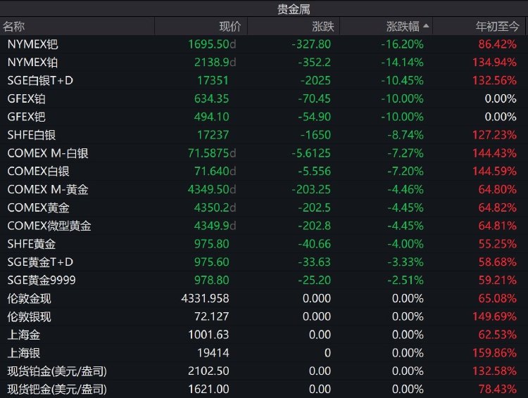 期货方面,COMEX白银跌7.2%,报71.64美元/盎司;COMEX黄金跌4.45%,报4350.2美元/盎司,创近两个月来最大单日跌幅;NYMEX钯跌16.2%,报1695.5美元/盎司;NYMEX铂跌14.14%,报2138.9美元/盎司。
