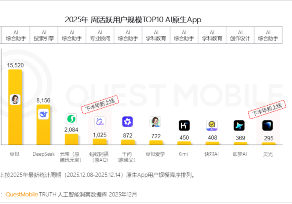 QuestMobile发布AI应用排名:豆包、DeepSeek、元宝、蚂蚁阿福位列前四,灵光进前十
