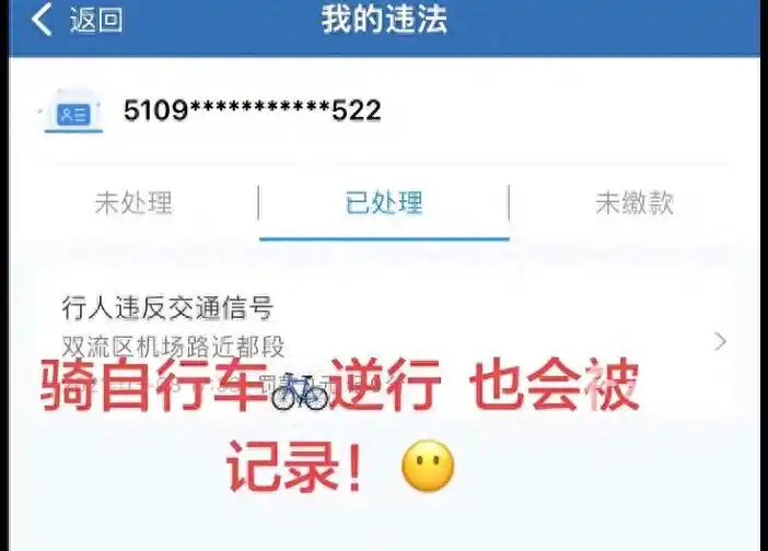近日,一名网友发帖表示,自己因在双流区机场路近都段骑自行车逆行的记录被同步到“交管12123”App中,该截图在网络上流传引起广泛讨论,上面的违法记录显示“行人违反交通信号”,地点为双流区机场路近都段。为何非机动车逆行也会被同步至“交管12123”?12月4日,记者联系到成都交警进行了解。