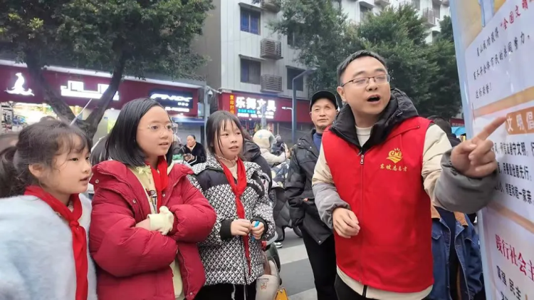 “小朋友,遛狗牵绳、不乱堆杂物,这些生活细节都是文明的体现!”活动现场,志愿者们身着红色马甲,向学生和家长发放城市文明手册,并耐心普及文明出行、垃圾分类、邻里互助等实用知识,引导大家从身边小事践行文明理念。