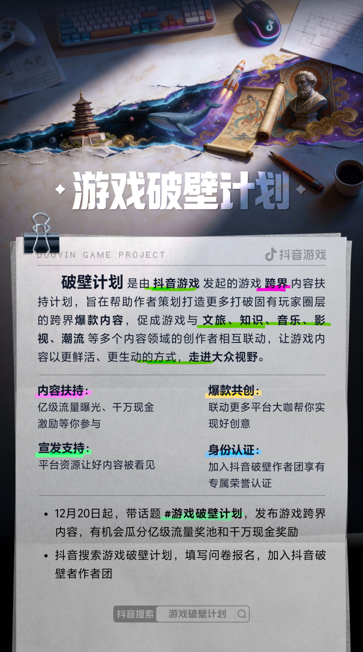 12月20日起,创作者带话题“游戏破壁计划”,发布游戏跨界内容,即可参与活动。创作者还可抖音搜索“游戏破壁计划”,填写问卷报名,加入抖音破壁者作者团,获得专属荣誉认证。抖音将对作者团成员提供流量、现金、平台资源等多重激励,并支持创作者参加共创活动,与更多游戏达人联动打造爆款内容。