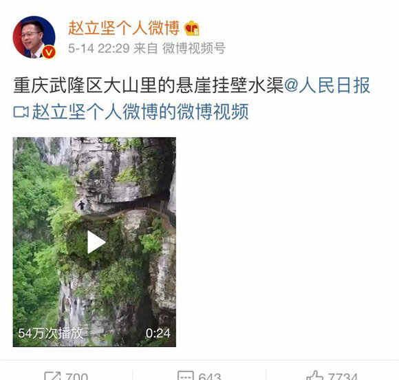 5月14日10点29分,外交部发言人赵立坚在个人微博上,发布了一则武隆悬崖挂壁水渠的航拍视频。