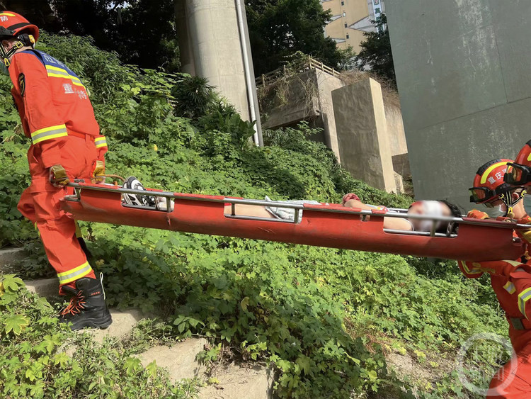 消防救援人员到达现场后发现,小女孩跌落地点在高架桥下,前往救援的道路只有一条宽不足半米的小路,碎石多,救援车辆不能直达,消防救援人员只能背着救援装备,徒步前往。