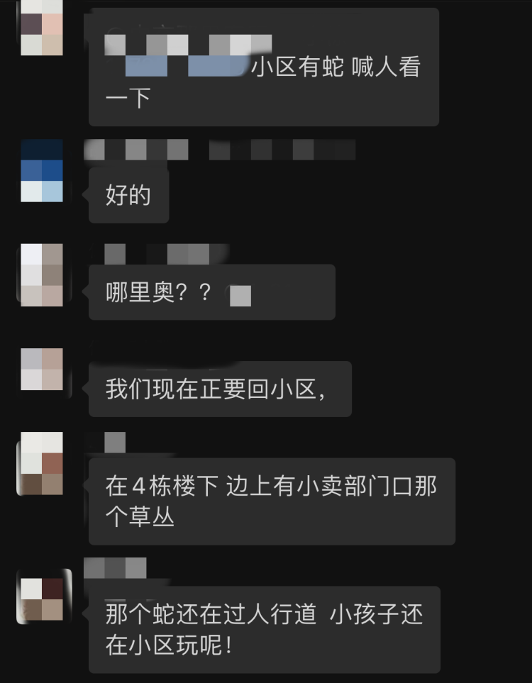 “当时光线有点昏暗,只见蛇黑黢黢的,身上有没有花纹没有看清楚。我没想到小区里居然有蛇,也不知道是不是毒蛇,晚上在附近散步、玩耍的小孩很多,真担心小孩子被蛇咬到!”杨女士说,另外,自家住在二楼,阳台外有树枝,要是蛇通过树爬到家里来了,还真是吓人!