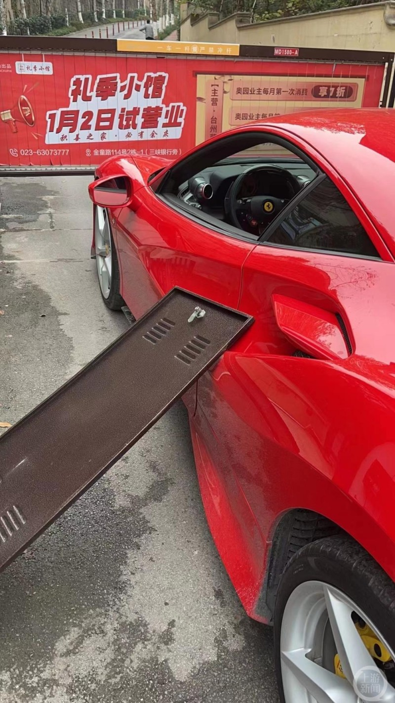 “真是新年开‘门’红!”1月5日,重庆的黄先生开着400多万元新买的红色法拉利陪朋友去渝北一别墅区看房,没想到在过道闸时,旁边的电箱盖竟然落下,砸中了法拉利的左侧车身。黄先生表示,除了3万多元的维修费用,物业方面还要赔偿20万元折损费。这个要求是否合理?8日,上游新闻记者对此进行了了解。
