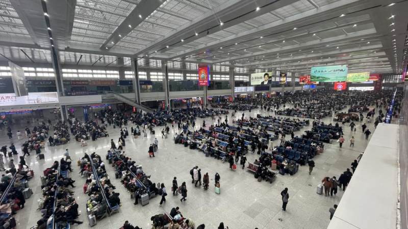 早上9点,重庆北站候车大厅,旅客们提着行李箱,抱着年货,牵着孩子,守候在各检票口。