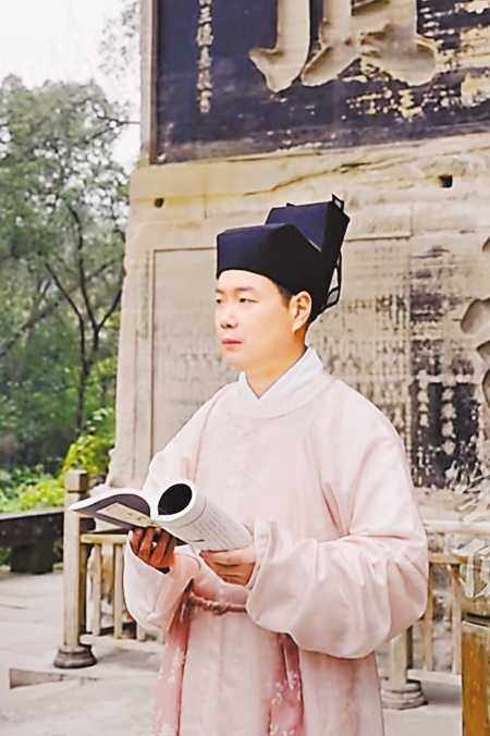 碧绿如玉的龙水湖上,一叶扁舟飘然而至,一位“翩翩公子”摇着折扇,站立船头,好不惬意;在大足石刻宝顶山景区,一位文质彬彬的古代官员在千手观音、卧佛、吹笛女等摩崖造像前辗转,追古思今……