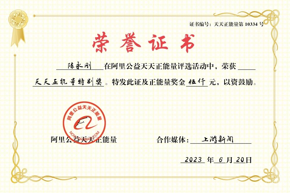 20日,阿里公益天天正能量团队获悉此事后,决定联合上游新闻,为陈永刚颁发“天天正能量特别奖”,奖金5000元。