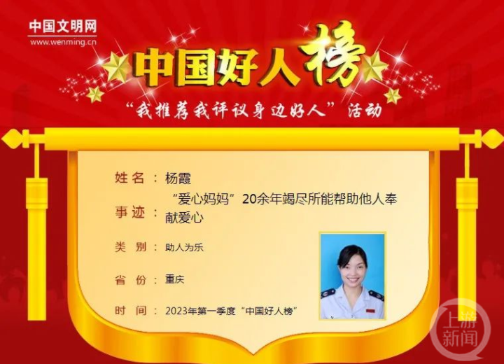 为此,杨霞也荣获了2022年度“感动重庆十大人物“、”重庆好人”等荣誉。
