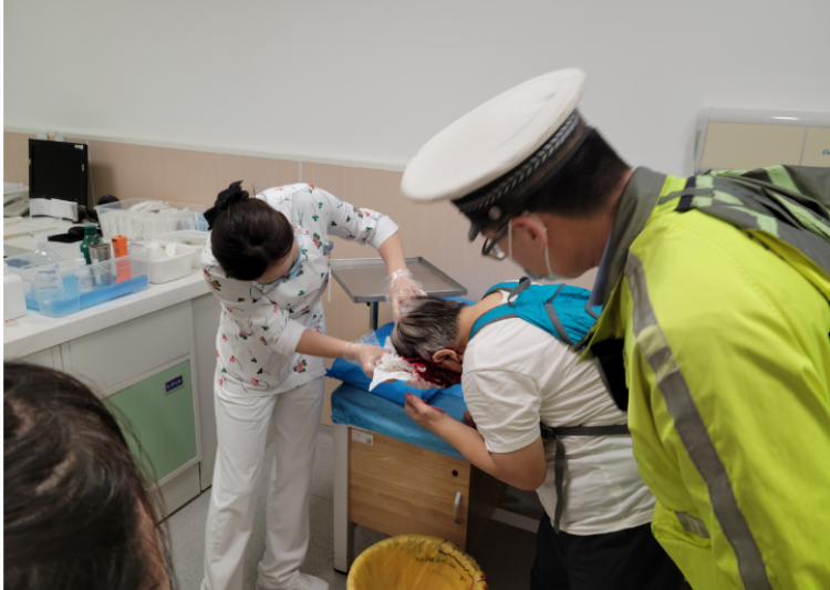 汪女士告诉民警,自己在洪崖洞人行天桥下走路时,额头不小心撞到铁栏杆导致血流不止。民警看到情况紧急,立即驾驶警车搭乘汪女士及家人紧急赶往最近的重医附二院,同时上报指挥中心。