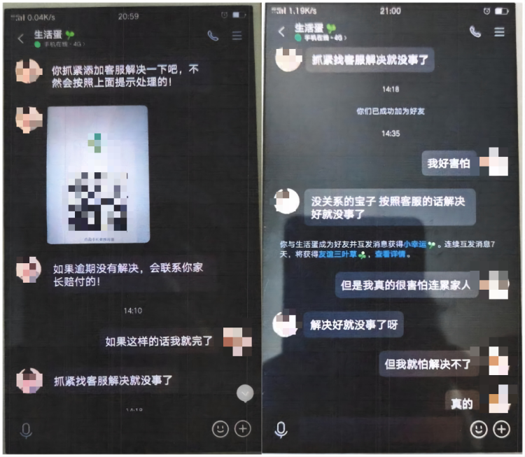 小鱼看到消息被吓到,害怕坐牢也不敢给家人说,于是赶紧添加对方推荐的客服解决问题。客服开语音称同意把恶意盗取的皮肤进行返还,并称这件事属于机密,又指导小鱼骗其母亲的手机“查资料”,实则转账。对方通过和小鱼视频通话,在视频里出示二维码,小鱼用其母亲的手机先后9次进行转账验证,被骗23816元。