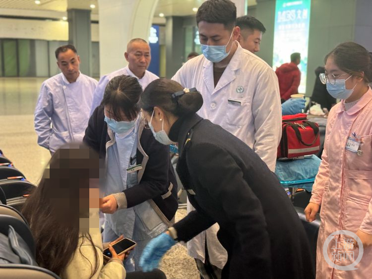 肖雪赶赴现场后,发现该名旅客躺在地上一动不动,嘴角伴有流血,失去意识。先一步赶到的工作人员朱敏用纸巾擦拭着旅客嘴角的血渍,汪龙则不停呼唤旅客姓名,试图唤醒她的意识。肖雪立即疏散围观旅客,确保现场空气流通,并拨打120急救电话。“重庆西站有名旅客突然倒地,现在人不清醒,请你们马上派救护车过来!”肖雪说。