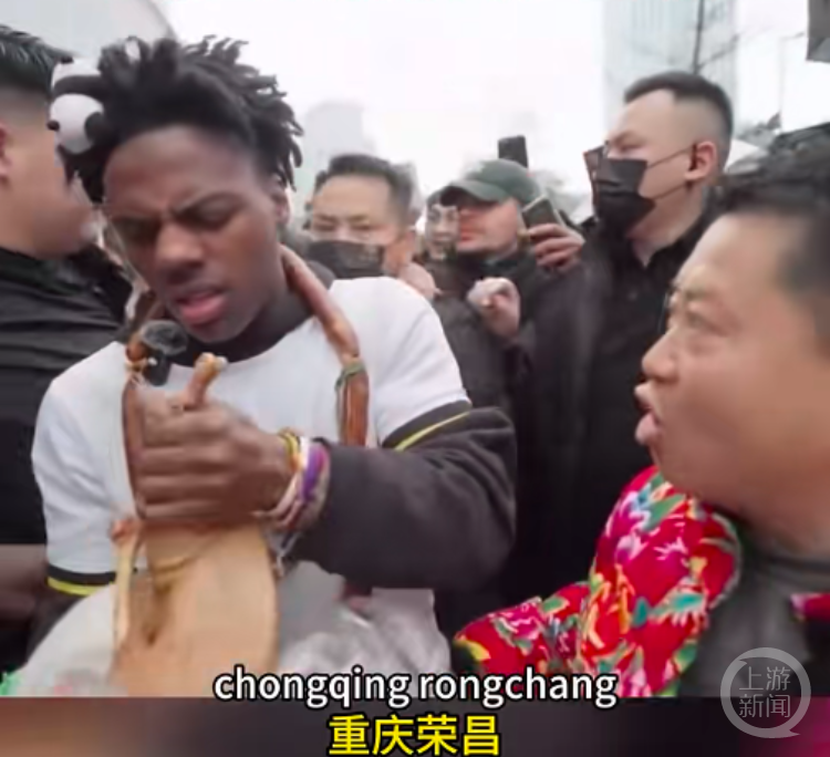近期,全球顶流网红“甲亢哥”(网名“IShowSpeed”,因“甲亢式”直播风格被网友熟知,被称为“甲亢哥”)来到中国多个城市进行直播,此举引爆互联网。3月31日,“甲亢哥”在成都街头被一位来自重庆荣昌的主播在镜头前成功投喂荣昌卤鹅。此举引发热议,相关视频刷爆网络,不少网友表示,这下全世界都知道荣昌卤鹅了。上游新闻(报料邮箱:baoliaosy@163.com)记者搜索发现,该主播是在重庆荣昌区小有名气的网红“荣昌江哥”,他目前在某短视频平台有16.8万粉丝。4月1日,“荣昌江哥”向上游新闻记者讲述了自己给“甲亢哥”投喂荣昌卤鹅的经过,并表示希望把荣昌卤鹅推向全世界。