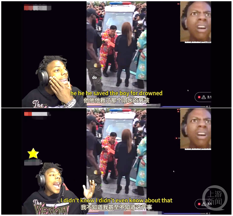 “甲亢哥”在直播中表示第一次听说“卤鹅哥”曾经救过落水男孩。网络图