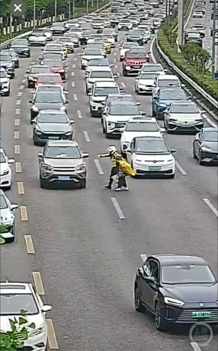 渝都大道是城市快速路,限速100公里,车速快,车流量大。当时,这位老人还行走在超车道上,身边车辆呼啸而过,随时都有发生事故的风险。