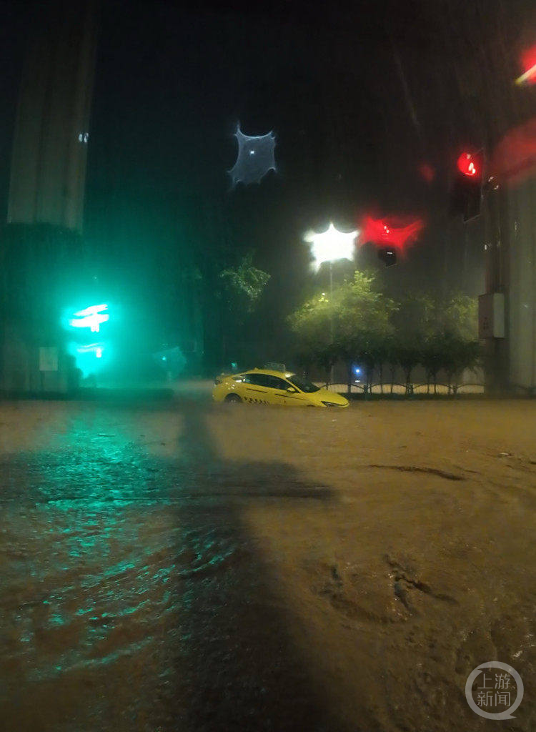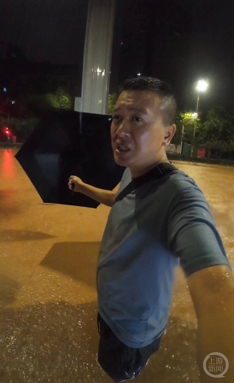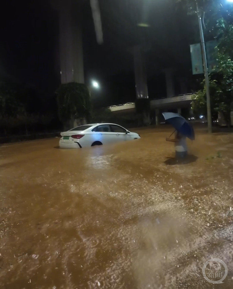 7月9日凌晨,重庆巴南区受暴雨影响积水严重。市民喻先帅在回家路上发现自家楼下路段积水严重,有一辆出租车已经“深陷”其中,因为担心过往车辆遭遇相同的情况,于是他在路边守护了两个多小时。