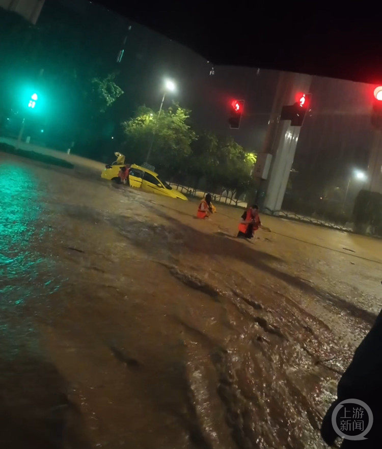 看到一辆出租车被困水中,司机和乘客还坐在车上,喻先帅急得大喊,“怎么还坐在车上?”“快下来啊!”水越涨越高,看着出租车上的人出不来了,喻先帅连忙找到不远处的消防车,把他们带到了出租车被困处。随后,消防员扯起了一根救援绳,帮助被困人员从一米多深的水中转移出来。