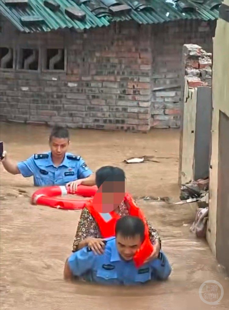 “别怕,我背你出去!”8月11日清晨,北碚区公安分局北温泉派出所辖区一村子因暴雨出现积水,当地民警赶到被积水困住的居民家中展开救援。救援人员介绍,积水的位置超过1米。直到最后一名村民被护送至安全地带时,他们的全身早已湿透。