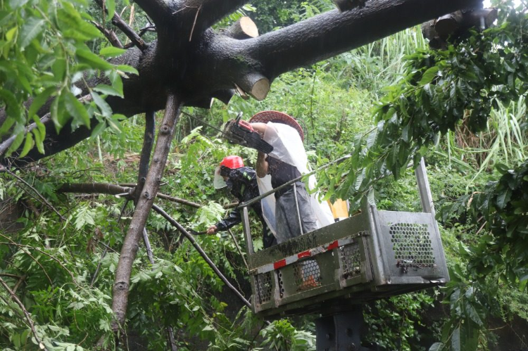 在云阳环湖绿道滨江公园,抢险人员在升降机上采取锯断方式,对倒掉的树木及断枝进行紧急处理。 通讯员 谭启云 唐彬 杨佳奇 摄