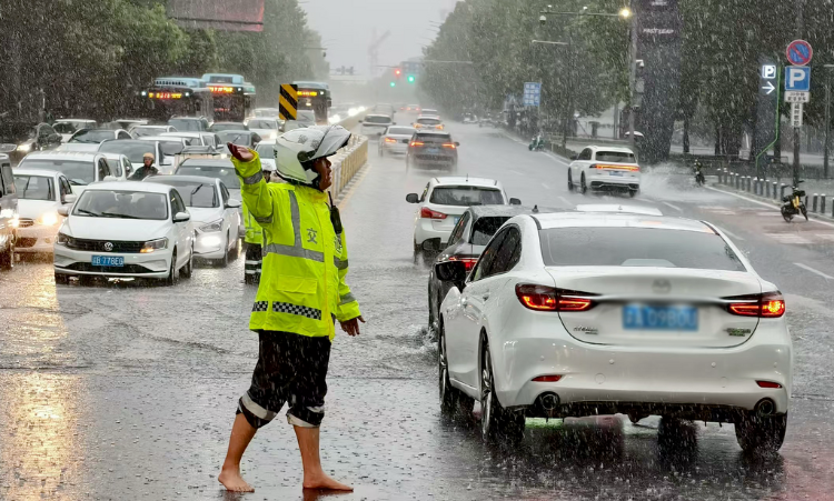 8月11日上午8时许,在大学城北路西路路口,个别低洼处道路出现积水,影响正常通行。高新骁骑队员张皓轩一把脱掉灌满雨水的鞋袜,光着脚蹚在浑浊的积水中,通过指挥手势、大声喊话和启动警灯,及时提示行人和车辆注意安全通行,严格规范车辆驾驶人保持安全车距。“到水积得最深的地方去,这样站在路中央好让车辆驾驶员能一眼看到我们!”